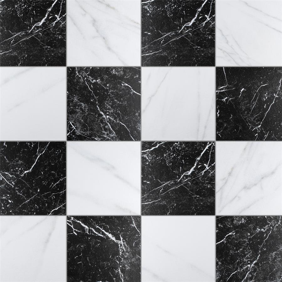 Our Ruzzini 17-7/8 in. x 17-7/8 in. Porcelain Floor and Wall Tile encompasses the beauty of old-world European elegance through a worn marble appearance. This marble alternative offers a fresh twist to classic elegance with a large format checkboard design. A chalky, satin white glaze is complemented with stormy grey veining, which varies per tile for added authenticity. The opposing charcoal black squares are accented with white veining as well, offering balance to the contrasting colors. Realistic imitations of scuffs and spots that are the marks of well-loved, worn, century-old tile bring rustic charm with a touch of sophistication to your space. Save time and labor spent arranging smaller square tiles and instead install these durable porcelain slabs, which have four 8-3/4 in. squares separated by scored grout lines. The scored grout lines can be grouted with the color of your choice to further customize your installation. Tile is the better choice for your space. This tile is made from natural ingredients, making it a healthy choice as it is free from allergens, VOCs, formaldehyde and PVC.