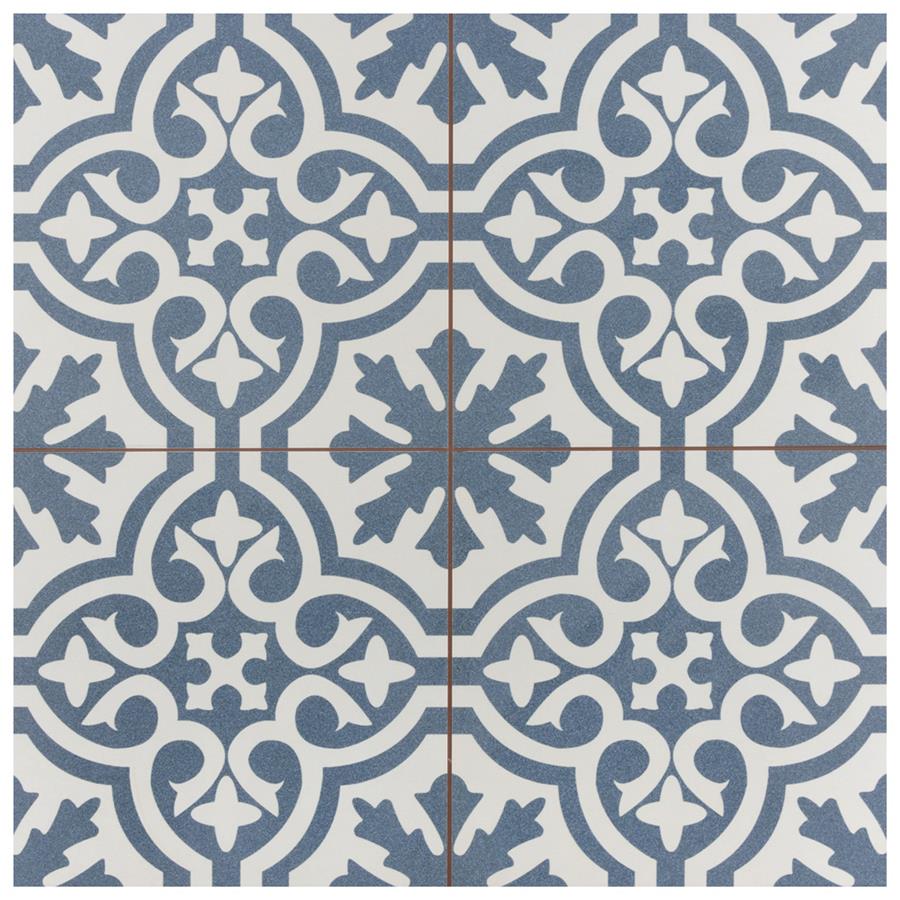 Capturing the artisanal look of cement tile, our Berkeley Blue Ceramic Floor and Wall Tile offers an encaustic, old-world design that can blend into any décor. Save time and labor spent arranging smaller square tiles and instead install these durable ceramic slabs, which have four squares with scored grout lines. With a recognizable European-inspired design, the simplistic arcs frame the snowflake inspired patterns that create continuity throughout the installation. Set on an eggshell base glaze, the teal blue designs offer the ability to be used in modern and rustic settings. The scored grout lines can be grouted with the color of your choice to further customize your installation. Use this tile in most interior settings, including kitchens, showers, backsplashes and entryways.